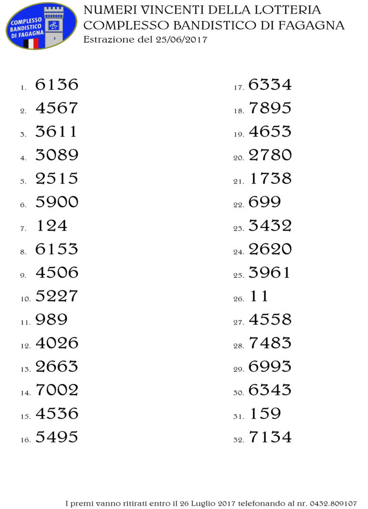 Complesso Bandistico di Fagagna Numeri vincenti Lotteria